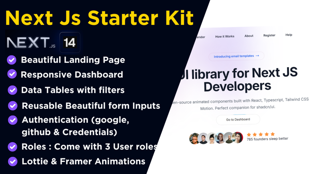 You will get a comprehensive Next.js TypeScript Starter Kit featuring a beautiful landing page, responsive dashboard, data tables with filters, reusable form inputs, authentication, and role management.
